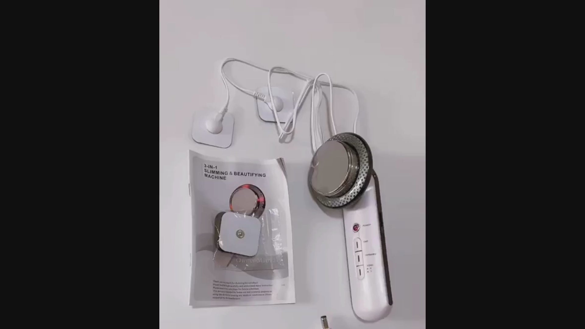 El dispositivo viene con manual de instrucciones. Dispone de 4 pastillas de estimulación eléctrica y el cableado. El dispositivo utiliza 110-240Volt AC.